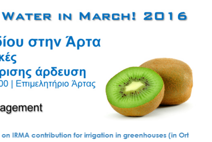 Το 2016, οι εκδηλώσεις θα επικεντρωθούν στην άρδευση της καλλιέργειας ακτινιδίου, μίας δυναμικά αναπτυσσόμενης καλλιέργειας στην πεδιάδα της Άρτας. Θα παρουσιαστεί το σύστημα IRMA_sys (http://arta.irrigation-management.eu/) και οι δυνατότητές του όσο αφορά την διαχείριση άρδευσης σε φυτείες ακτινιδιάς. Ακόμη περιλαμβάνεται μία εκδήλωση περιβαλλοντικής εκπαίδευσης σχετικά με την άρδευση.